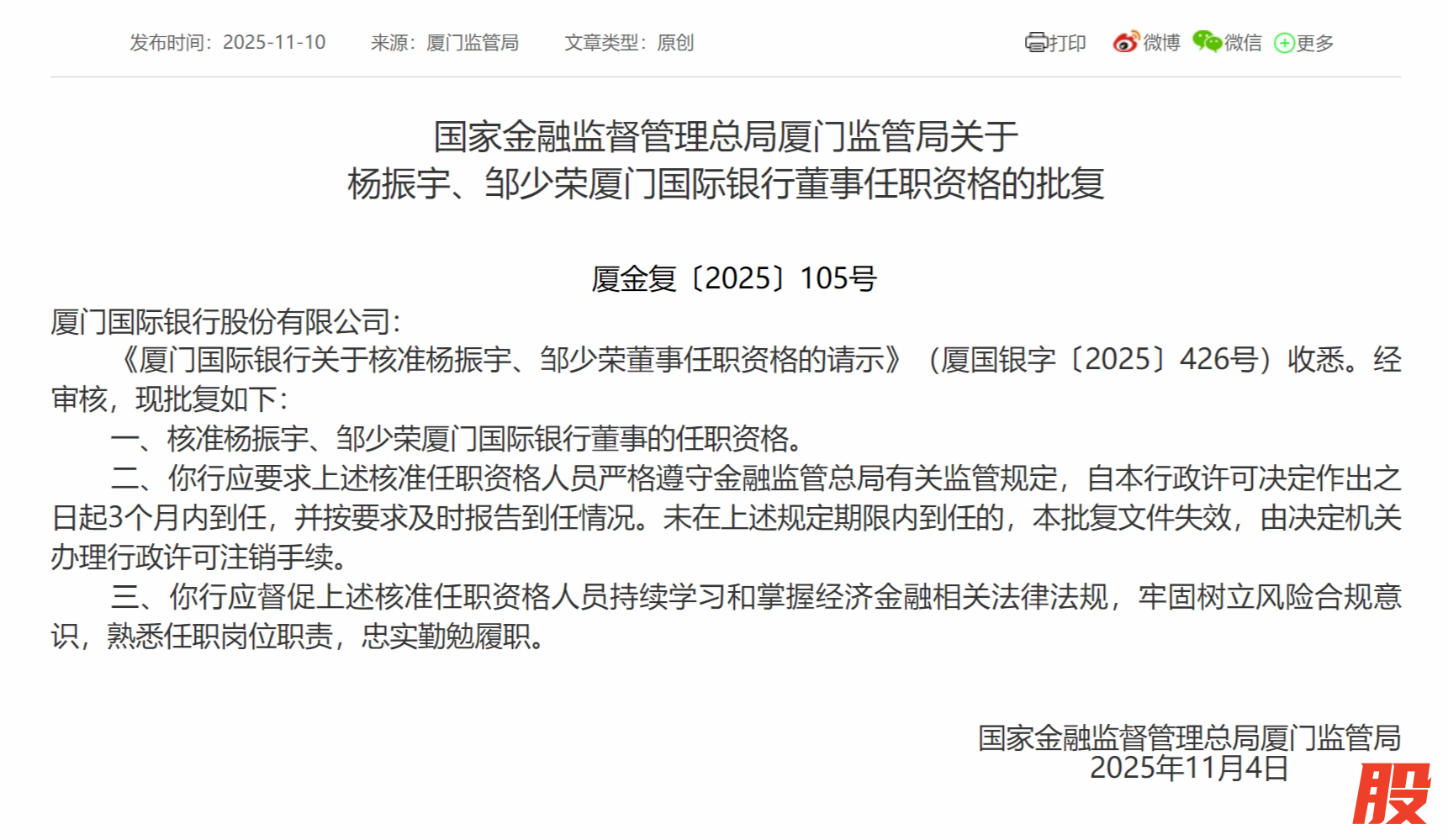 11月10日,国家金融监督管理总局厦门监管局发布关于杨振宇、邹少荣厦门国际银行董事任职资格的批复,杨振宇、邹少荣厦门国际银行董事的任职资格。